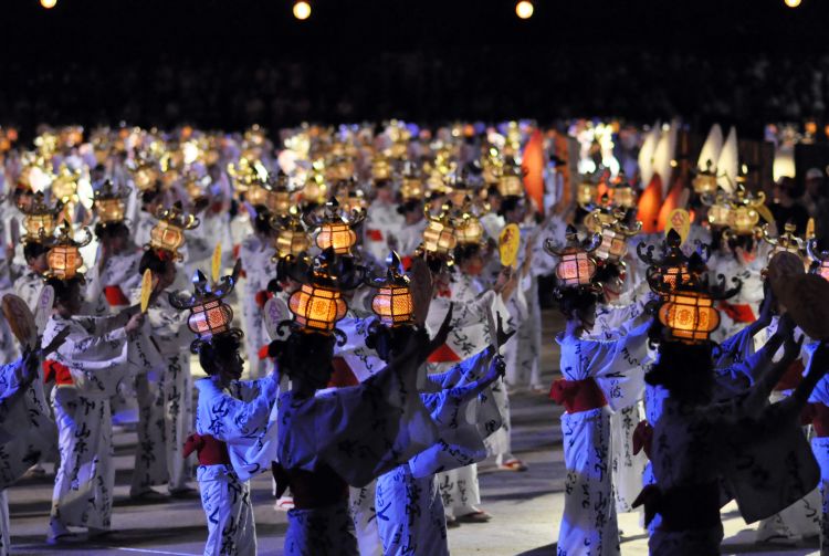 Праздник танцующих фонарей настолько ярок и интересен, что ради него приезжают со всей Японии.Зрелище впечатляет: тысяча женщин, одетых в форменные юката (летнее кимоно), танцуют с привязанными к голове фонарями! При этом участницы шоу ещё и поют...